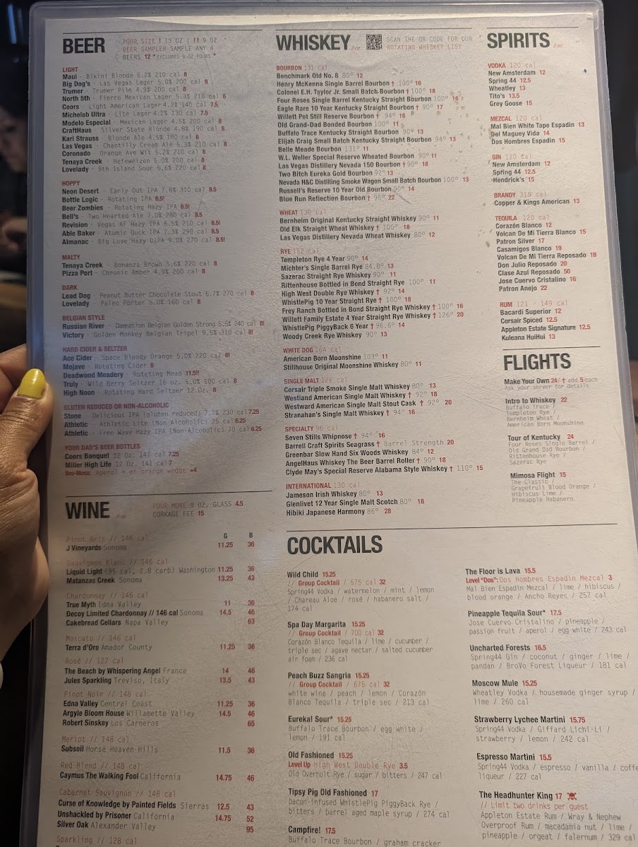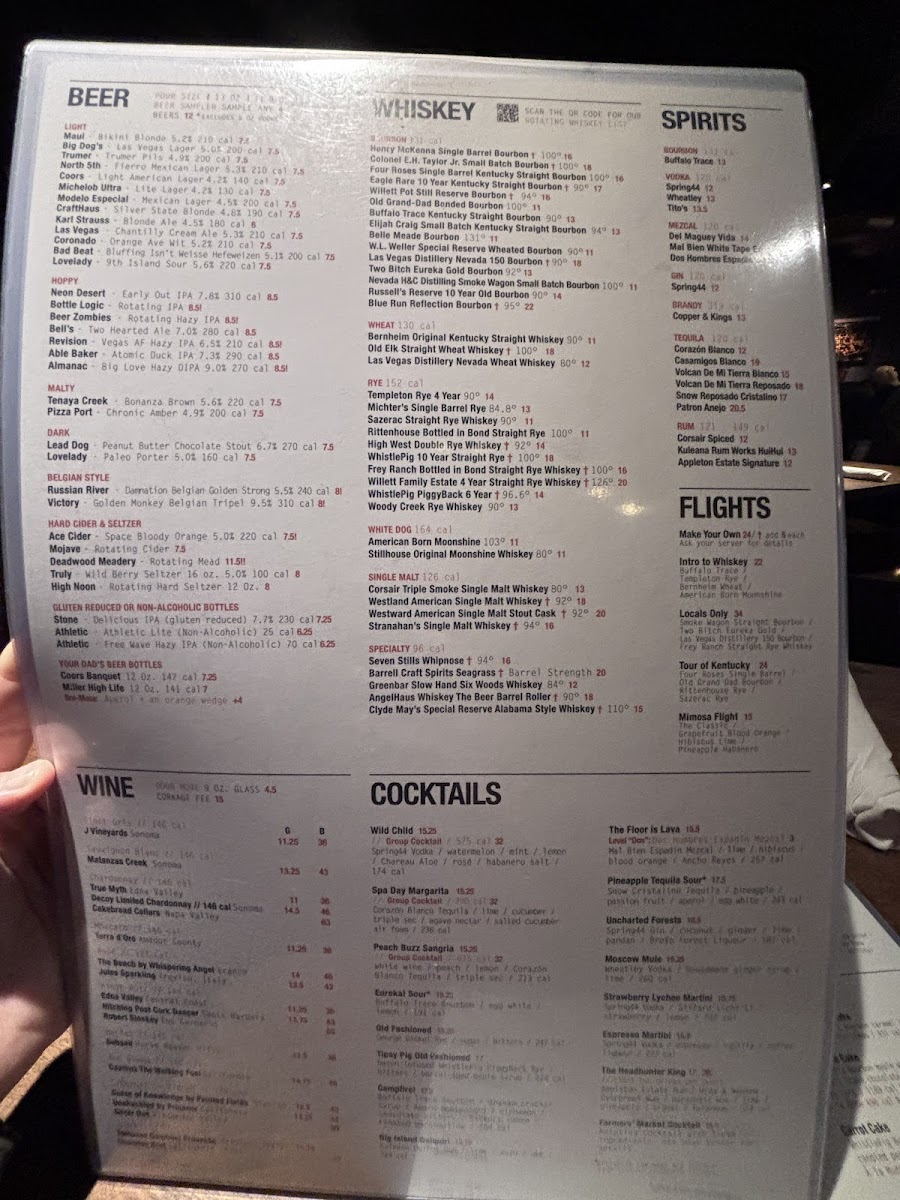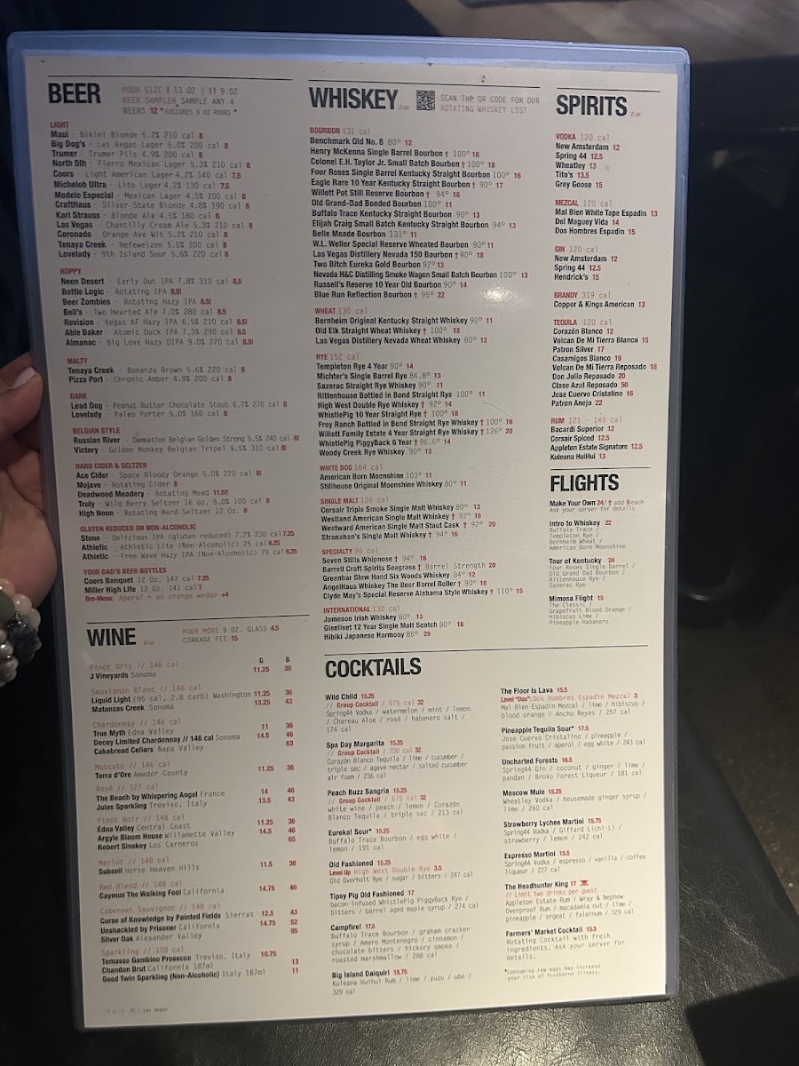Main Courses: This section includes a variety of hearty options such as slow-cooked Barbeque Pork Ribs served with truffle corn, a French Dip sandwich with roast beef and horseradish aioli accompanied by signature fries, and a Braised Short Rib dish available after 5pm with potato purée and wilted spinach. Additionally, the AllWorld Breakfast Burrito is available, featuring eggs, bacon, avocado, and salsa, ideal for a morning meal.