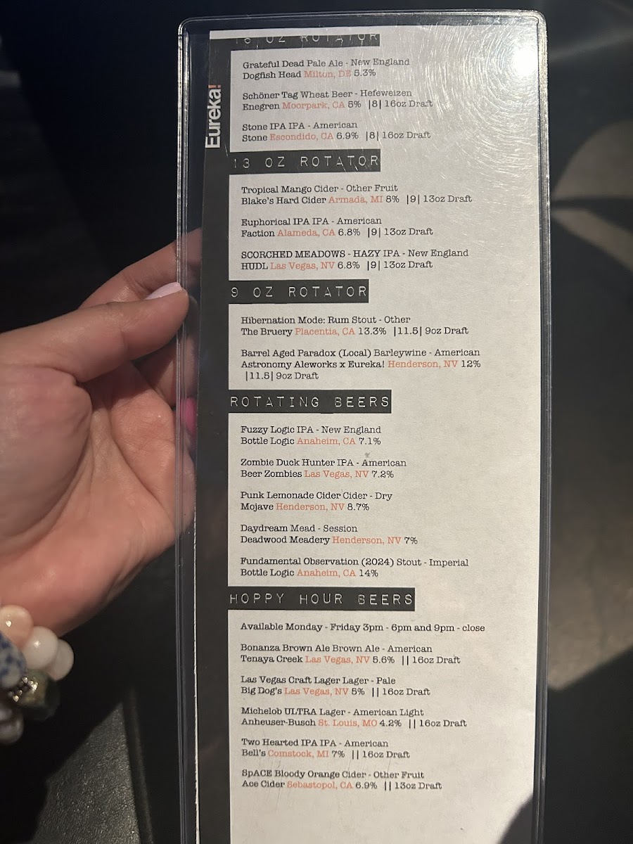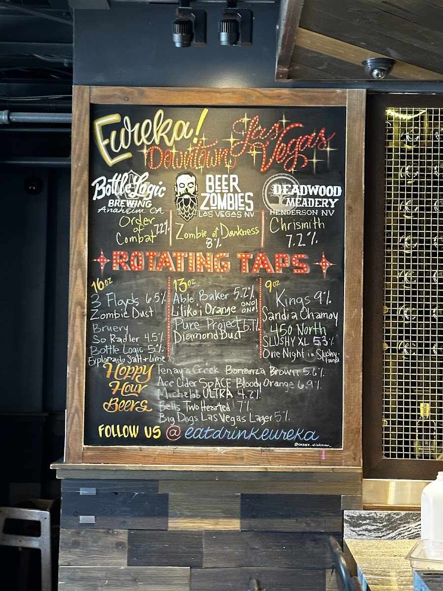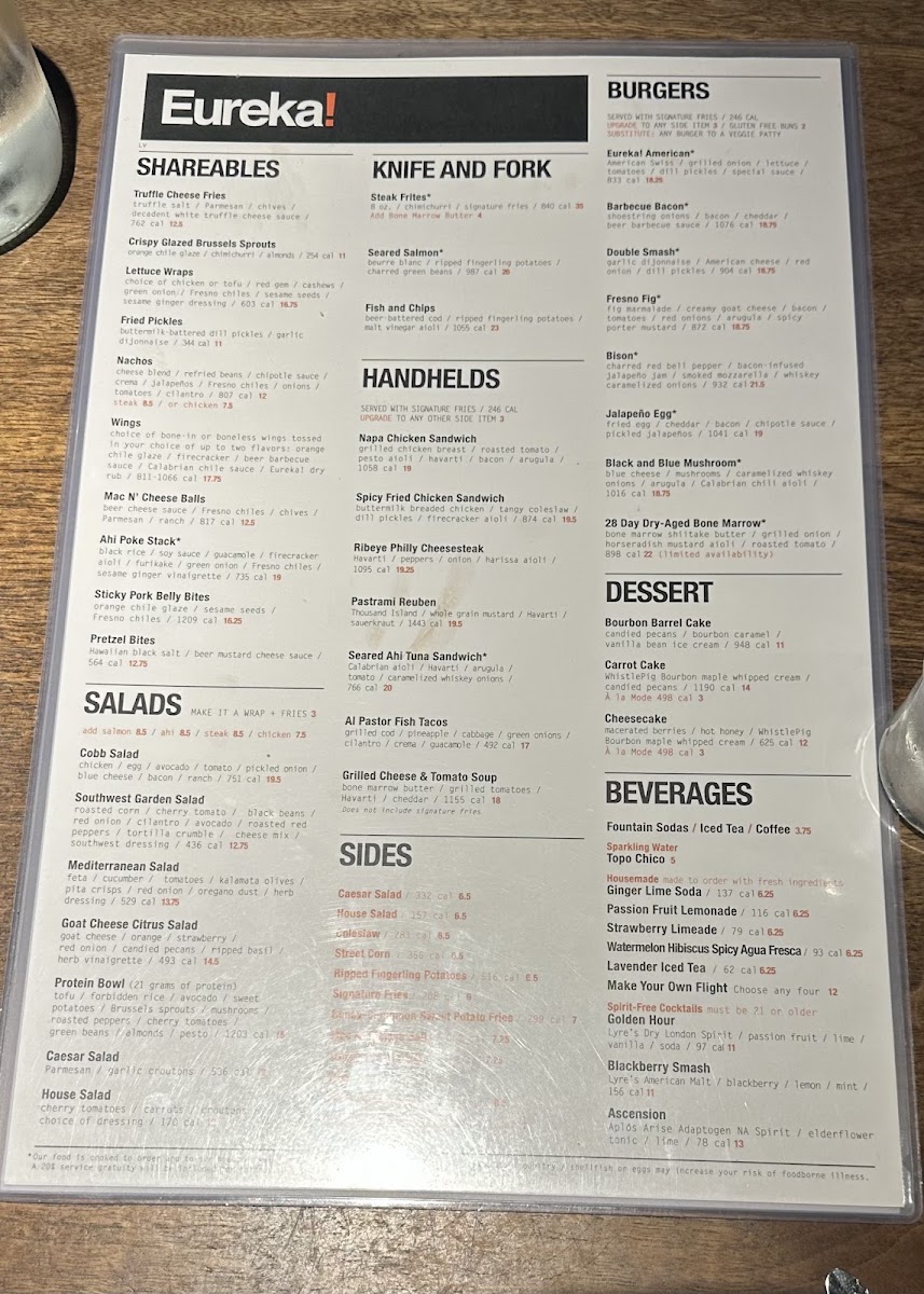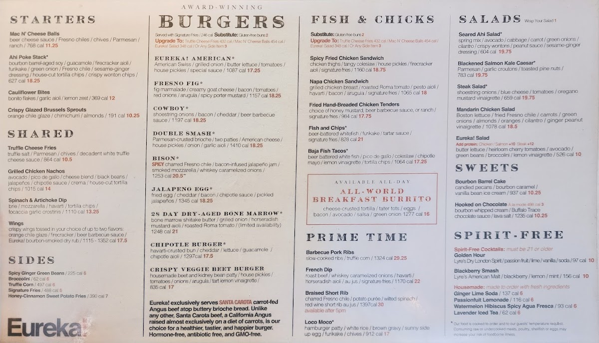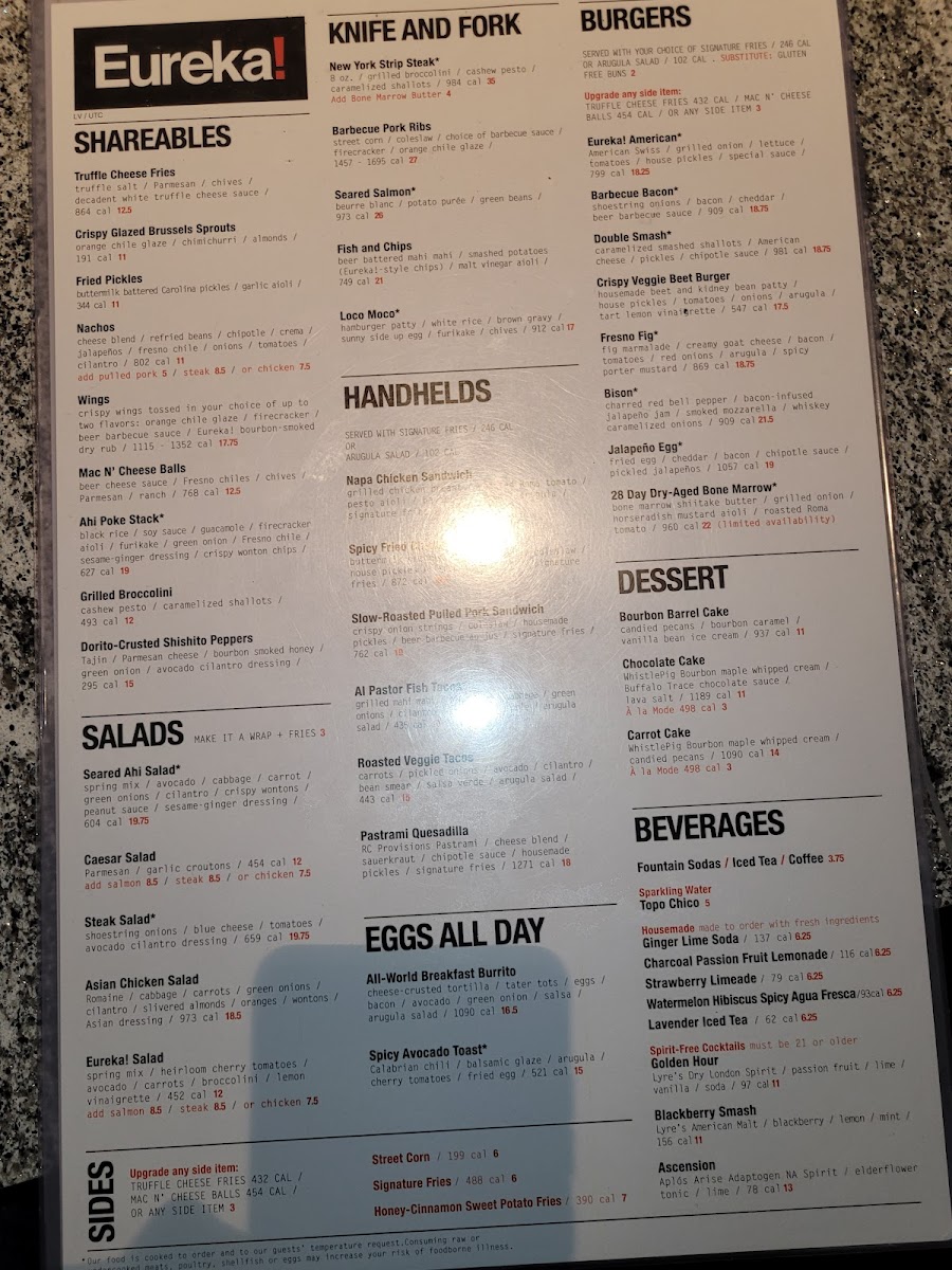 The menu at Eureka! Discover American Craft features a diverse selection of American-style dishes and craft beverages, suitable for various dining occasions including breakfast, lunch, and dinner. It is structured into distinct groups to cater to different preferences and mealtimes.